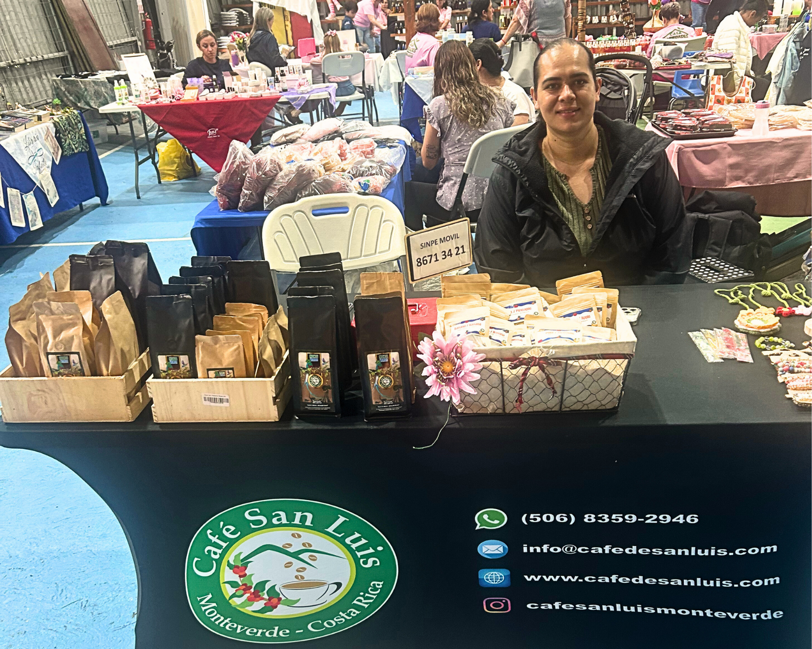 Denia, de Café San Luis, es una vendedora local de la comunidad de San Luis, en Monteverde. Para ella, el mercado es mucho más que solo vender; es un lugar para conectar, compartir, hacer amigos y conversar con todos en lo que ella describe como un “grupo muy bonito”. Su producto principal es el café, que también es su producto estrella. Dependiendo del día, quienes visiten su puesto también pueden encontrar algunas de sus artesanías y frutos secos a la venta.